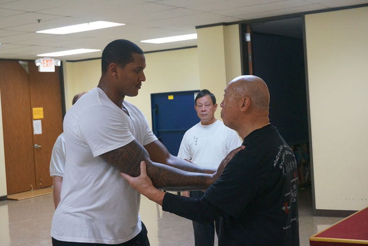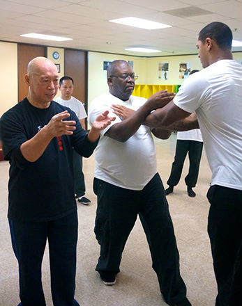 Sifu Kenneth Chung (鐘萬年) Demonstrating the Wing Chun Concept "Don't be Greedy, Don't be Afraid" (不貪不畏) with student Hector Chum in 2013 Workshop